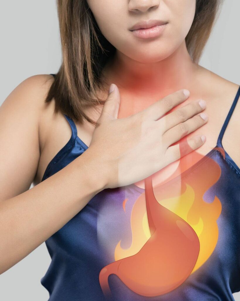 • Azia/queimação que pode subir do peito para a garganta.